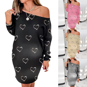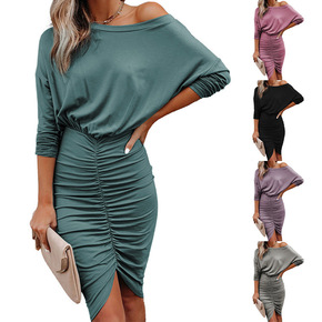 跨境2021 秋冬新款女装长袖中裙纯色性感斜肩修身...