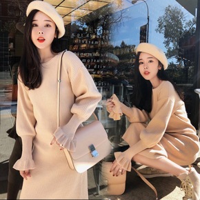 春秋装新款韩版荷叶袖网红毛衣裙过膝女套头中长款打底...