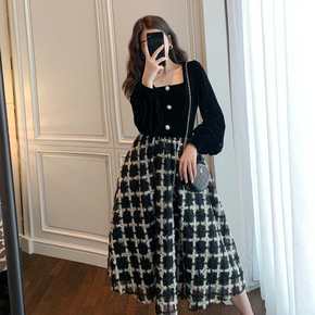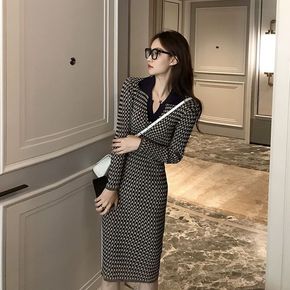 小香风POLO领千鸟格针织连衣裙秋季包臀过膝修身显...
