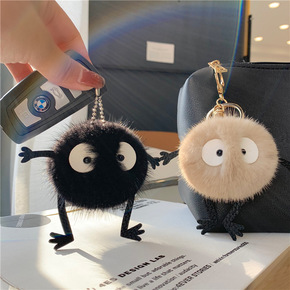 真水貂毛小煤球汽车钥匙扣挂件可爱毛绒黑煤炭灰尘精灵...