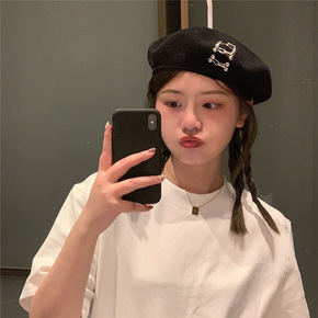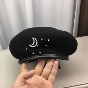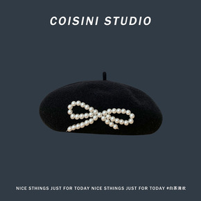珍珠蝴蝶结黑色羊毛混秋冬新款贝雷帽子女秋冬保暖画家...