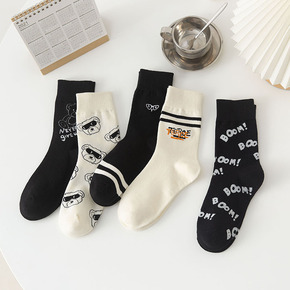 袜子女春秋季中筒袜可爱小熊日系原宿创意黑白长筒棉i...