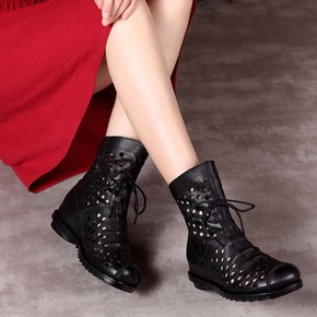 以一牛皮软底网靴圆头系带夏季短靴坡跟洞洞靴休闲新款...