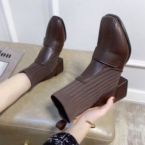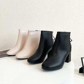 2021秋冬季新款尖头高跟韩版英伦风女短靴粗跟后拉...