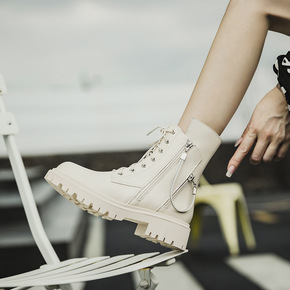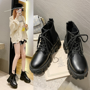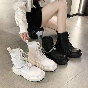 马丁靴女2021年秋季英伦风厚底圆头系带链条机车靴...