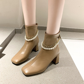 马丁靴女2021年韩版秋季新款方头珍珠休闲粗跟后拉...