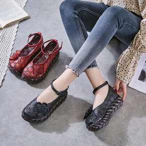 2020新款民族风淑妹真皮厚底时尚激光手工花朵平跟...