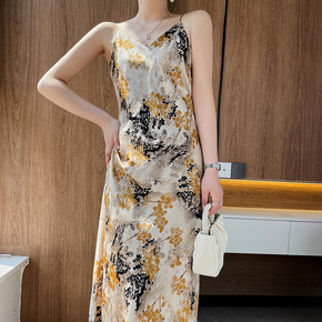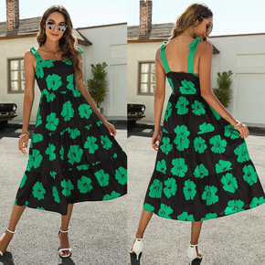 2022夏季跨境新品女装吊带抹胸印花休闲大摆裙绿色...