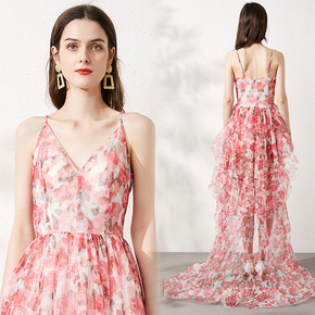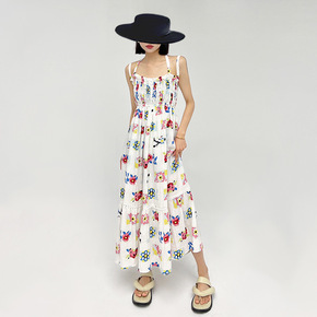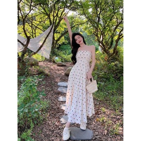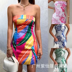 2022年夏季上新时尚度假风印花百搭抹胸连身裙洋气...
