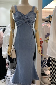 英伦气质POLO领衬衫拼接牛仔衬衫裙抹胸荷叶下摆连...