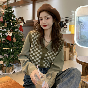 实拍~ 韩国ins设计感假两件衬衣袖棋盘格针织衫秋...