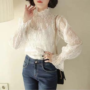韩版洋气蕾丝打义衫女高领内搭喇叭袖性感镂空网纱配毛...