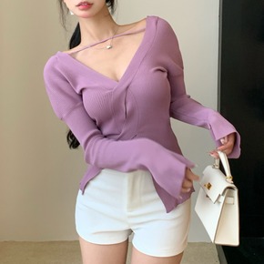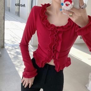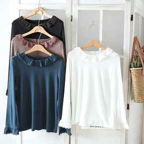 港味复古木耳边长袖T恤女配皮草内搭打底衫秋冬别致修...