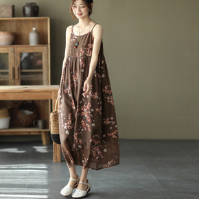 夏季复古丝麻印花吊带裙女新款高腰显瘦大摆气质碎花裙...