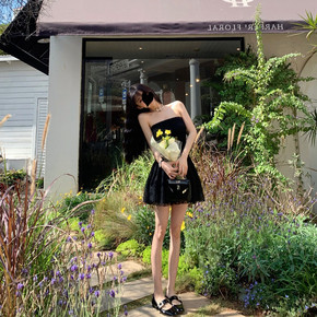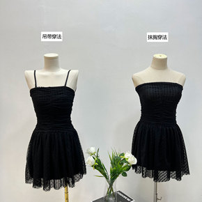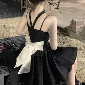 后背蝴蝶结吊带小黑裙蕾丝花边抹胸挂脖连衣裙女短款2...