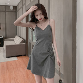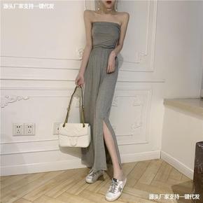 2022夏季新款韩版灰色抹胸长裙修身显瘦开叉连衣裙...