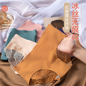 新品冰丝内裤女 中低腰舒适柔软透气高档冰丝拼接蕾丝...