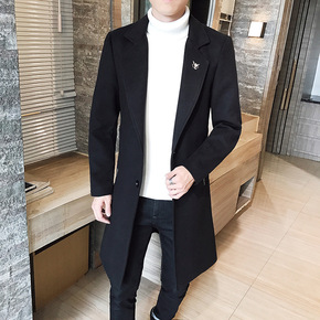 毛呢大衣男中长款秋冬季过膝英伦风羊绒宽松黑色风衣加...