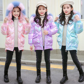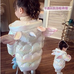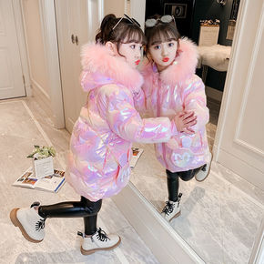 2021女童亮面棉衣炫彩韩版休闲小女孩棉袄中长款卡...