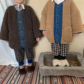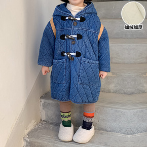 儿童冬季夹棉中长款连帽牛仔棉衣男女童宝宝加绒厚牛角...