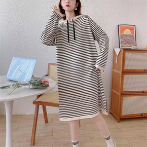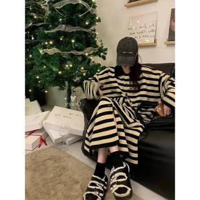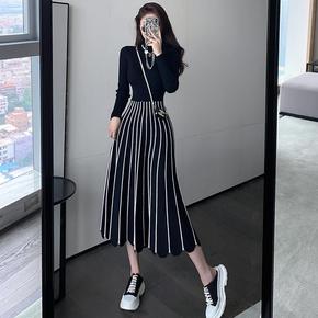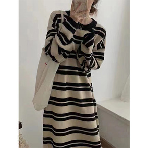 黑白条纹毛衣裙女2022秋冬新款韩版慵懒风过膝长款...