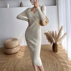 马甲裙配大衣的内搭针织连衣裙女中长款开叉打底毛衣长...