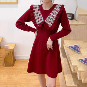 2022年秋冬新款法式打底毛衣裙收腰显瘦娃娃领长袖...