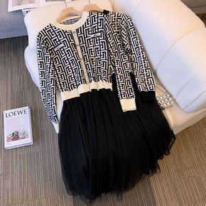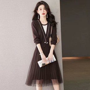 假两件针织连衣裙女早秋装2022年新款设计感网纱拼...