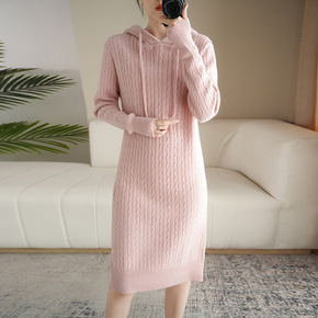 100纯羊毛连帽针织连衣裙女秋冬中长过膝毛衣裙显瘦...