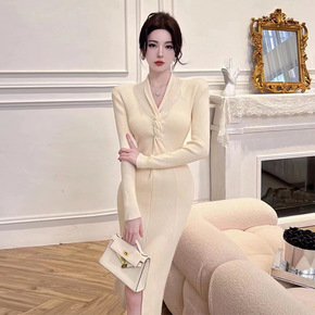 收腰显瘦针织连衣裙女2022秋冬法式小众设计感中长...