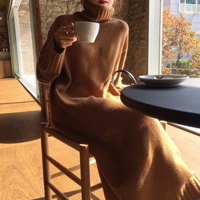 秋冬高领加厚内搭打底长款毛衣裙过膝设计感配大衣条纹...