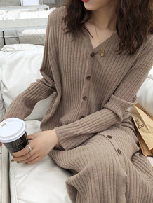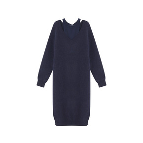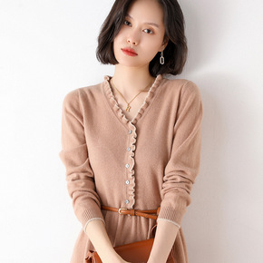 秋冬新款时尚v领木耳边羊毛连衣裙女宽松毛衣裙过膝针...