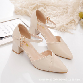 休闲软皮中跟尖头少女伴娘粗跟包头单鞋法式一字扣中空...