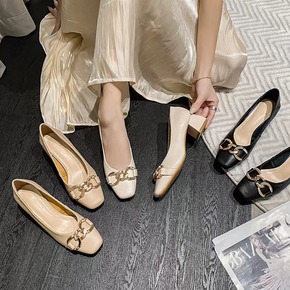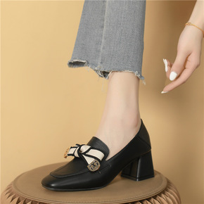 方头百搭真皮单鞋2022秋季新品鞋子女生工作穿粗跟...
