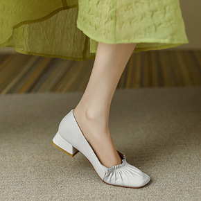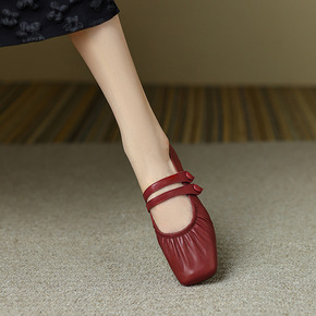 亦川~简约百搭真皮奶奶鞋女法式褶皱柔软平底鞋40-...