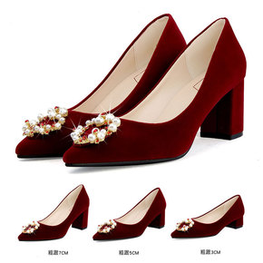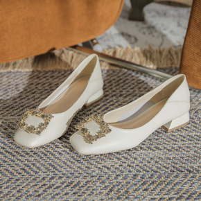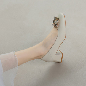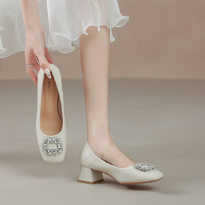 方跟单鞋女中跟2021夏新款水钻网红四季真皮女鞋方...