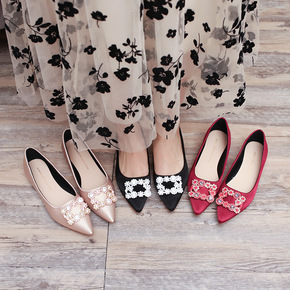尖头平底婚鞋女2022水钻鞋女绿色孕妇新娘伴娘结婚...