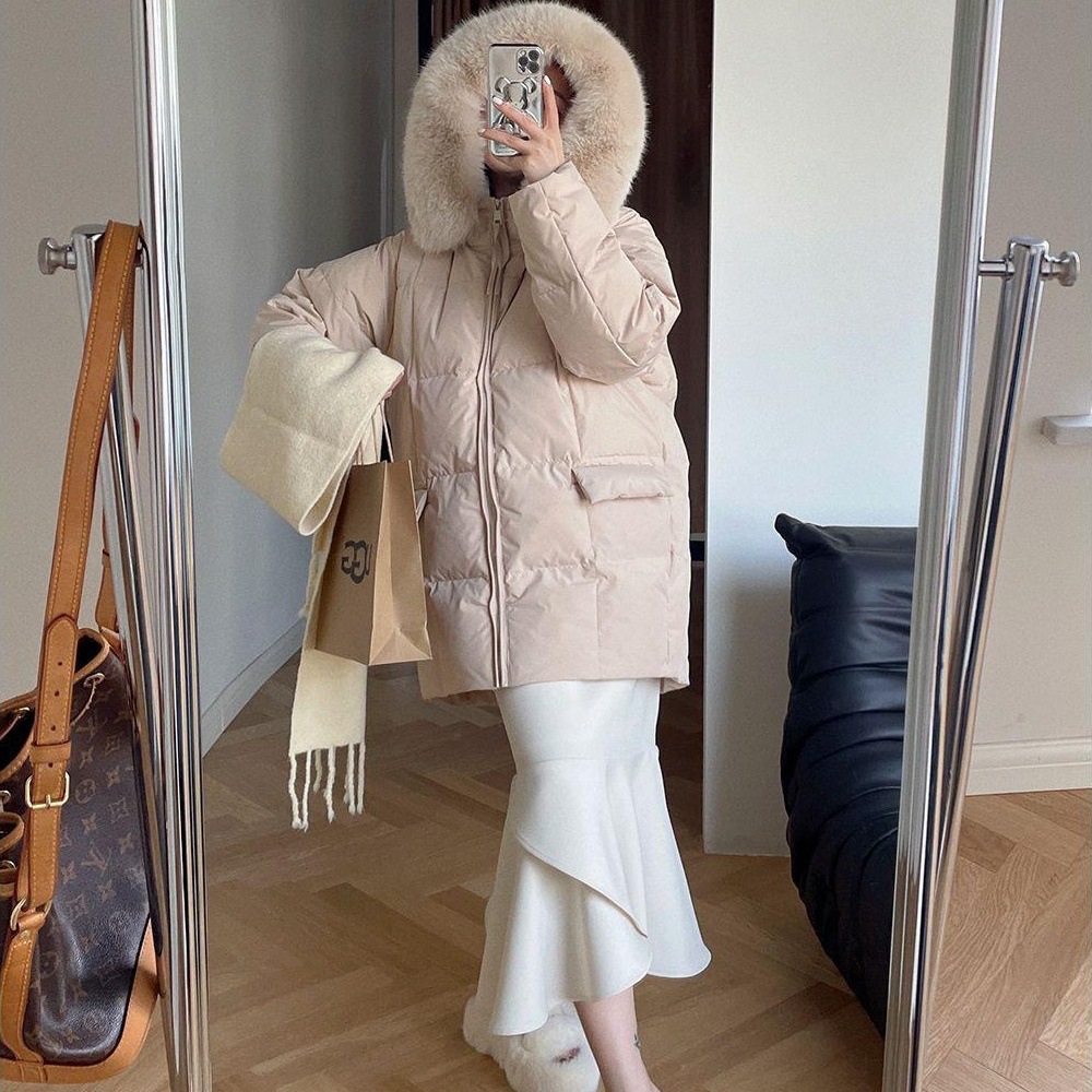仓古木方糖毛领90白鸭绒羽绒服女21冬季韩版中长款...