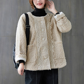 洋气羊羔绒短款外套圆领蕾丝花边大码胖mm冬装保暖加...