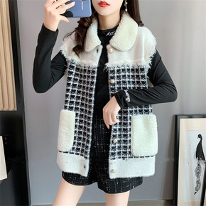 仿羊羔绒格子拼接马甲外套女秋冬装百搭女士无袖坎肩背...