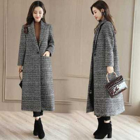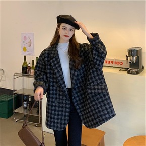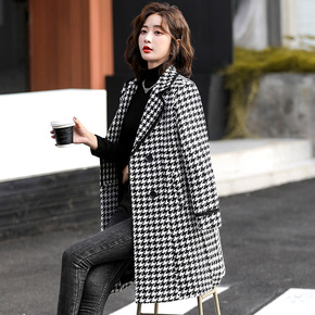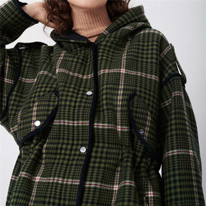 20冬季新款保暖羊毛羔格纹中长款毛呢大衣外套连帽蝙...