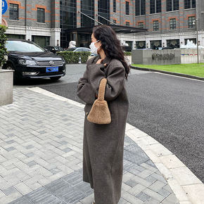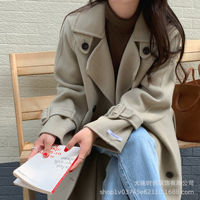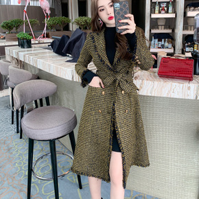 2021秋冬装气质编织呢双排扣中长款大衣流苏毛呢加...