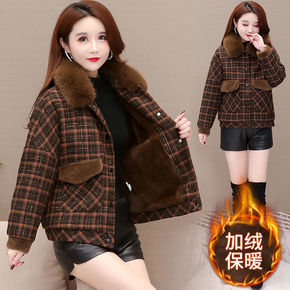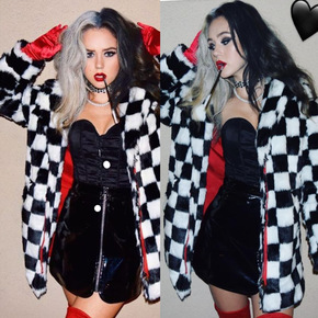 2022年冬季新款时尚欧美风黑白格子外套仿兔毛保暖...
