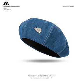 韩版水洗牛仔贝雷帽金属贴标复古文艺画家帽适合圆脸个...