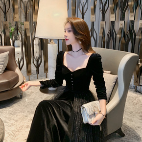 今年流行的连衣裙长裙2021跨境秋冬裹胸收腰网纱裙...