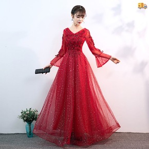 合唱服长裙古筝演出服少女中国风大合唱团开场舞礼服红...