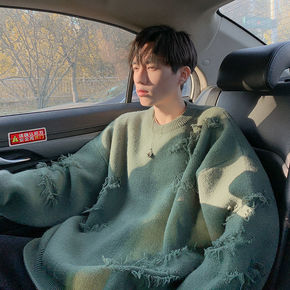 包邮破洞圆领毛衣男女秋冬设计感小众ins潮流外套宽...