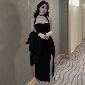 赫本风黑色背带裙女秋冬季金丝绒2022新款小个子内...