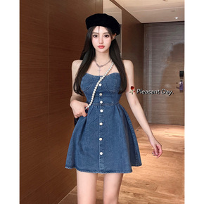 牛仔抹胸连衣裙女甜辣风性感收腰A字裙夏季短裙复古无...
