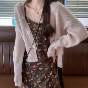 吊带裙单/套装 秋冬碎花吊带连衣裙学生女复古开衫毛...